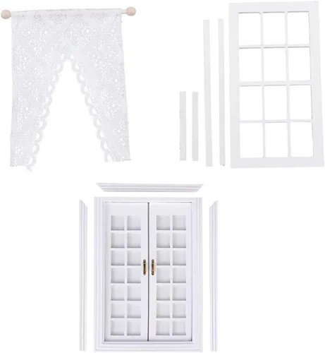 Hecho a mano, exquisita artesanía Adecuado para casa de muñecas en miniatura 1:12; gran decoración para tu casa de muñecas, hace que tu casa de muñecas se vuelva hermosa y cálida Material: Abedul, Madera, Encaje Color principal: Blanco 1/12 madera en miniatura 28 paneles y marco de ventana con cortina de encaje, muebles sin pintar para casa de muñecas accesorios de fabricación de bricolaje