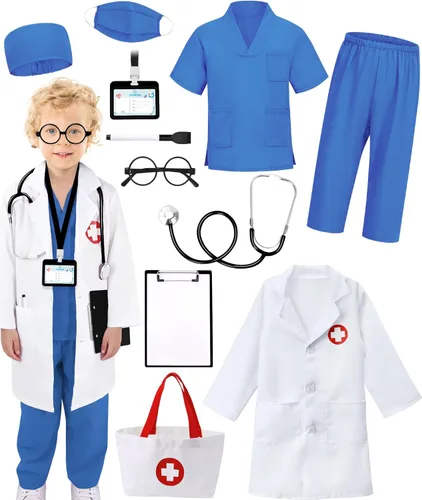 Disfraz de médico para niños: este juego de disfraz de médico para niños incluye una bata de laboratorio blanca, camisa/pantalón, gorra, máscara, estetoscopio de trabajo, gafas, placa de identificación, bolígrafo, portapapeles, tablero de escritura borrable, bolsa; todo lo que los niños necesitan para vestirse y disfrutar de un juego de rol inmersivo Juego inmersivo realista: el estetoscopio de trabajo permite a los niños escuchar latidos reales del corazón para un auténtico juego de rol de médico; la tabla de escritura borrable y el bolígrafo permiten tomar notas fácilmente y divertirse con un paño; el disfraz de enfermera para niños fomenta la imaginación práctica y el juego creativo Material de calidad: el abrigo de laboratorio y el disfraz para niños están hechos de tela suave, transpirable, ligera pero resistente para comodidad durante todo el día; el portapapeles de plástico reutilizable y los accesorios soportan un juego de simulación duradero; 6 tamaños disponibles para niños de 3 a 11 años Disfraz educativo del día de la carrera para niños: diseñado para jugar a simular, este disfraz de médico para niños pequeños permite que los niños se disfrazen con orgullo para futuras carreras, juegos de rol como médicos, enfermeras, dentistas, científicos, veterinarios mientras construyen confianza, creatividad y habilidades sociales Múltiples ocasiones: este disfraz de médico para niños es un maravilloso regalo para niños que aman jugar al médico, enfermera, dentista, científico o veterinario, adecuado para disfraz de Halloween, disfraz de día de carrera, juego de rol escolar de jardín de infantes, semana del espíritu o juego de simulación diario