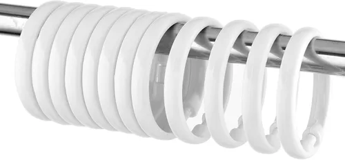 【Reliable Material】The white shower curtain hooks is made of quality plastic, which is light in weight and durable, and will not deform when used, and can be matched with most shower curtains. 【Easy to Install】Simple snap buttons make shower curtain hooks plastic easy to install or remove from the shower curtain rod. 【Easy to Use】O-shaped design enables the plastic shower curtain hooks to slide easily on the rod, which has good stretching ability and is not easy to slide out. 【Widely Used】suitable for most sizes of shower curtains. Can be applied to bathrooms, dressing rooms, windows, etc. 【Value Pack】You will receive a pack of 12pcs shower curtain rings plastic, which is enough for use and replacement