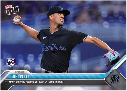 2023 Topps Now Eury Perez #315 -RC Rookie 1st MLB Victory Comes at Home vs Washington Nationals - 5/18/23 - Baseball Trading Card- Miami Marlins. Topps stated Print Run of Only 909 Made! Card Shipped in Protective Screwdown Holder.