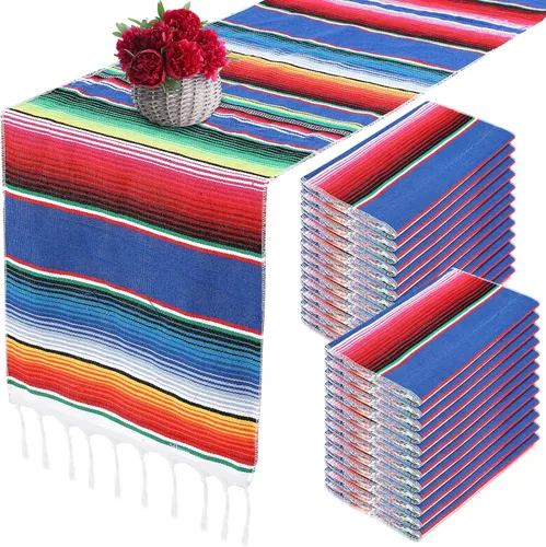 algodón Lo que recibirás: recibirás 24 banderas de mesa mexicanas de aproximadamente 14 x 84 pulgadas, adecuado para la mayoría de mesas largas o redondas; colores brillantes para decorar tu hogar y fiestas, aportando hermosos colores y creando un buen ambiente festivo Diseño creativo: alfombra de mesa de fiesta mexicana con diseño tradicional de rayas clásico simboliza la felicidad; la combinación de estructura tejida sólida y borde de flecos añade elegancia; y la combinación de múltiples colores hará que la mesa se vea más encantadora Materiales de calidad: estas mantas de serape están cosidas en todos los lados y están hechas de material de algodón, construcción sin costuras, bordes finamente cosidos, no se caen fácilmente, rayas clásicas e impacto de color vibrante, añadiendo color a la decoración del hogar Ampliamente aplicado: nuestros manteles mexicanos para fiesta de boda son adecuados para manteles, tapetes de picnic, decoraciones de pared, mesas de exterior, mesas de café y cualquier cosa que necesites cubrir, en el tamaño correcto, peso ligero y fácil de transportar; también puedes utilizarlos como mantas, chales o bufandas para decorar tu ropa o mantener el frío fuera Decoración ideal: coloridos manteles de algodón con flecos pueden hacer que tus momentos importantes sean más memorables, adecuados para bodas mexicanas, despedidas de soltera mexicanas, fiestas de cumpleaños mexicanas, fiestas de carnaval, celebraciones del Cinco de Mayo, aportando calidez y alegría a tu fiesta
