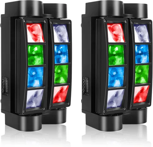 Modos de funcionamiento: la luz de araña LED garantiza un gran rango de proyección, Y1: 60-150 grados, Y2: 60-150 grados, 8 haces mágicos, cada haz no solo puede crear el efecto de luz perseguidora, sino que también puede continuar convirtiendo el movimiento oscilante. (Mando a distancia no incluido) Fuente de luz: 8 cuentas de luz potentes con 4 en 1 rojo, verde, azul y blanco, el color se puede cambiar libremente y combinar para traer hermosos efectos visuales. 4 modos: 1. Modo automático; 2. Modo controlado por sonido (micrófono incorporado, el estilo de iluminación cambia automáticamente con la música); 3. Modo DMX512; 4. Modo maestro-esclavo (funcionamiento sincronizado con múltiples luces). Luz LED DJ de araña con flash electrónico de alta velocidad / estroboscópico aleatorio (1 – 25 veces/s), consta de dos rotaciones independientes impulsadas por motor y puede funcionar sola. Efectos de pulso y estroboscópico de hasta 1-25 destellos por segundo (rango regulable: 0-100%). Ocasión de aplicación: esta luz de cabeza móvil profesional es perfecta para mejorar la atmósfera en fiestas, bar, cumpleaños, bodas, vacaciones, eventos, espectáculos en vivo, Navidad/Halloween.