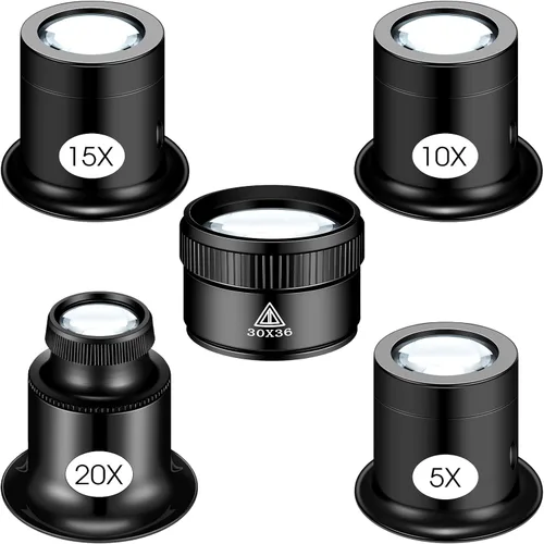 Material confiable: nuestra lupa para joyeros está hecha de lente de vidrio de doble capa y cuerpo termoplástico ligero, mano de obra fina, peso ligero y alto aumento, que puede proporcionarte un servicio prolongado 5 modelos para satisfacer tus necesidades: estas lupas monoculares portátiles están en 5 niveles de aumento diferentes, 5X, 10X, 15X, 20X, 30 x 36 mm, puedes elegir el aumento adecuado según tus propias necesidades para usar, para que puedas ver con claridad y cuidado Variedad para ver: las herramientas de lupa para joyería son adecuadas para examinar y ver una amplia variedad de artículos, como joyas, piedras preciosas, diamantes, monedas, sellos, divisas, antigüedades, pinturas, fotografía, negativos de película y otros detalles intrincados Fácil de transportar: el pequeño tamaño de nuestra lupa es adecuado para guardar en tu bolsillo, mochila, bolsa de maquillaje, bolso de hombro, para que puedas observar lo que te interesa en cualquier momento y en cualquier lugar Esté dispuesto a compartir: puedes compartir estas lupas de joyería con tus amigos que aman experimentar, ancianos que coleccionan joyas y antigüedades, y amigos que coleccionan monedas, para que su trabajo o pasatiempo pueda obtener un buen apoyo y progreso