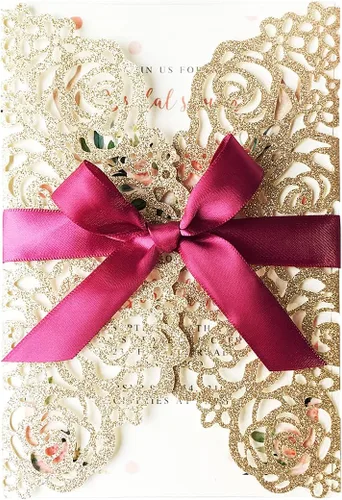 50 tarjetas de invitación de boda doradas de 5.12 x 7.28 pulgadas con lazo burdeos cortado con láser, invitación para despedida de soltera,