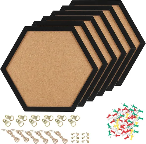 Sobre nosotros HAKZEON es un fabricante profesional de tableros de corcho hexagonales y una serie de otros productos. Haremos todo lo posible para proporcionarte productos de primera calidad a precios razonables. Todo lo que hacemos es aportar comodidad a tu vida y permitirte disfrutar de una vida mejor. ¿Por qué elegirnos? El tablero de corcho hexagonal está hecho de material de corcho natural, que es duradero, con una mejor durabilidad y una vida útil más larga. El clásico tablero de anuncios hexagonal con marco negro puede combinar perfectamente con cualquier estilo de decoración, añadiendo un ambiente elegante a tu casa. Los azulejos hexagonales de corcho son muy adecuados para asegurar fotos, notas, calendarios, menús, recordatorios, listas, planes de viaje, manualidades, pinturas, etc. El tablero de corcho hexagonal tiene una función de autorreparación y no deja agujeros antiestéticos. El tablero de corcho hexagonal es fácil de instalar, puedes instalarlos fácilmente en las paredes de casas, oficinas o escuelas. Especificaciones del producto Material: corcho y pino Tamaño: 11.7 x 13.5 pulgadas Grosor: 0.63 pulgadas Color: marrón y negro. El paquete incluye: 6 tableros hexagonales de corcho. 48 pasadores de empuje. 6 cuerdas de yute. 12 ganchos de montaje