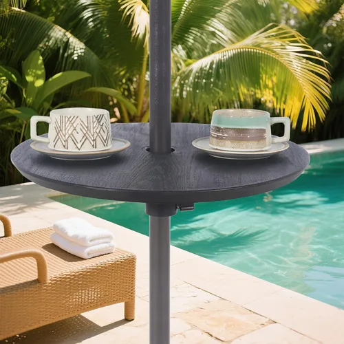 Tamaño de la mesa: 20 x 20 x 0.8 pulgadas de alto. La mesa de paraguas solo se adapta a postes de paraguas de mercado de 1.5 a 1.9 pulgadas de diámetro. Puedes colocarlo en cualquier lugar alrededor de tu patio o junto a la piscina. Hecho de polietileno de alta densidad duradero, sin mantenimiento, que no se oxida ni se astilla y no requiere mantenimiento. Diseño: el acabado negro mantiene su apariencia durante años. Una perilla giratoria en la parte inferior para asegurar firmemente los paraguas. Fácil montaje - Montaje parcial. Muy fácil de montar en postes de paraguas del mercado con tapa de bloqueo. La mesa auxiliar completa tu sombrilla para exteriores para una adición simple pero elegante a cualquier patio trasero, jardín o patio.