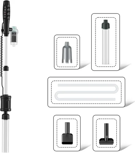 Limpiador de grava acuario multifuncional: aspiradora eléctrica AKKEE de 36 W para peceras y grava. El último diseño de control de mango hace que sea más fácil de operar y usar, puede realizar ① cambio automático de agua ② limpieza de grava, ③filtración y circulación de agua, ④ ducha de tortuga, raspado de algas, 6 succión de tanque séptico, apagado cronometrado, ajuste de potencia y otras funciones. No hay necesidad de comprar otras herramientas, ahorrando tiempo y dinero. La aspiradora eléctrica de grava AKKEE Fish Tank para acuario crea un ambiente de vida limpio y ordenado para tus mascotas favoritas POTENCIA DEL MOTOR AJUSTABLE: El motor limpiador de peceras tiene tres niveles de potencia: 36W, 27W, 19W. Puedes ajustar libremente la potencia de funcionamiento del motor de la aspiradora de grava del acuario. Puede ajustar la potencia de acuerdo con el tamaño del pez, que es más amigable con los peces jóvenes. La aspiradora de pecera tiene una succión más fuerte cuando se trabaja. Puede ayudarte a cambiar y añadir agua rápidamente y puede absorber la suciedad o las impurezas en la pecera FILTRACIÓN PROFUNDA DE 5 CAPA: El limpiador de grava de acuario está equipado con una copa de filtro, que contiene 5 capas de materiales de filtro como esponjas reutilizables, bolas de filtro biológico y bolas de carbón activado. Puede absorber eficazmente el 98% de las impurezas en el agua y proporcionar agua limpia y excelente calidad para tus mascotas. Es la mejor opción para la circulación de agua y duchas de tortuga Cierre temporal y longitud ajustable: la aspiradora de arena para acuarios tiene una función de apagado temporizado, puedes elegir dejar de funcionar automáticamente después de 60, 30 o 10 minutos, ¡lo que es conveniente y seguro! El kit de limpieza de peceras también está equipado con un tubo telescópico ajustable y una tubería de agua de extensión de 4.9 ft, puedes ajustar la longitud de la aspiradora de arena del acuario de acuerdo a diferentes tamaños de pecera o niveles de agua. Consejos: la parte del mango no es impermeable, por favor mantenla alejada del agua ACCESORIOS COMPLETOS INCLUYE: El kit de limpieza de aspiradora eléctrica de grava para acuario incluye todo lo necesario: 2 tubos de lavado de arena (para arena gruesa y fina), un cabezal de estiércol aspirador, una cuchilla de limpieza Alga, un adaptador de corriente CC 24V, una tubería de agua de 4.9 ft, un tubo de extensión, cubo de filtro de agua, manual de usuario (con pasos de uso en detalle)
