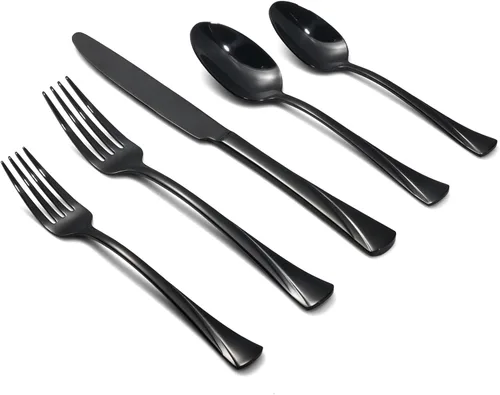 INCLUYE: Juego de cubiertos Black Mirror de 40 piezas con servicio para 8. El juego incluye 8 de cada uno: cuchillo de cena, tenedor de cena, tenedor de ensalada, cuchara de cena y cucharadita DISEÑO: Formas atrevidas, líneas de corte. Este es un juego de cubiertos de estilo artístico muy moderno. Hemos diseñado dos acabados diferentes, pulido de espejo y mate satinado, para presentar diferentes efectos Material: acero inoxidable 18/0 de alta calidad. Extra duradero y protección contra el óxido OCASIÓN: Ideal para el uso diario. Funciona bien con configuraciones de mesa modernas y tradicionales y complementa cualquier cristalería o vajilla CUIDADO: Apto para lavavajillas, nunca necesita pulido