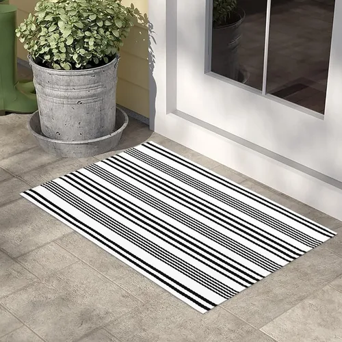 Patrón clásico de rayas: la alfombra para exteriores en blanco y negro cuenta con un diseño clásico a rayas que le da un estilo atemporal, con líneas limpias y un simple, adorna tus suelos e impresiona a tus invitados con un ambiente cálido y acogedor Felpudo de porche delantero: coloca esta alfombra a rayas con tapete de bienvenida al aire libre (no incluido) para hacer una elegante alfombra de puerta delantera, son resistentes y ofrecen un toque de personalidad para tu entrada y un saludo para amigos y familiares Construida para durar: construcción ultra resistente y tratada con rayos UV para resistencia a la decoloración, a menudo reversible, esta alfombra de cocina lavable a máquina es muy adecuada para colocar puertas cubiertas, balcón y otros lugares con mucho tráfico Usos multifuncionales: ideal para alfombras al aire libre, las alfombras se mezclan con las flores y árboles de la naturaleza, también se utilizan para alfombra de entrada, alfombra de porche, alfombra de puerta delantera, alfombra de cocina, alfombra de baño. Mientras mantiene su hogar limpio de suciedad exterior y escombros Limpieza y cuidado: Aspira tu alfombra a rayas para exteriores regularmente para mantener la vida y la belleza. Limpia los pequeños derrames inmediatamente secando con un paño limpio y seco. No frotes, simplemente presiona firmemente sobre el área afectada para absorber el líquido