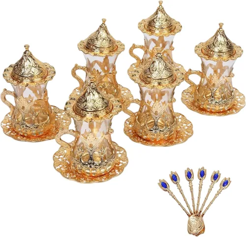 Auténtico diseño turco: inspirado en la cultura turca, cada vaso de té presenta motivos turcos tradicionales en el cuerpo de metal de zinc, proporcionando una estética elegante y culturalmente rica. Materiales de alta calidad: nuestros vasos de té están hechos de vidrio duradero y encerrados en un cuerpo de metal de zinc, asegurando la longevidad y manteniendo la temperatura de su té. Característica única del azucarero: cada vaso de té viene con un pequeño azucarero en forma de cúpula en la parte superior, lo que permite la adición tradicional de una pizca de dulzura con su té. Variaciones de color elegante: Disponible en dos colores distintos: amarillo dorado y blanco plateado, este juego de vasos de té complementa cualquier decoración del hogar y crea un llamativo ajuste de mesa. Juego de té integral: se vende como un juego de 6 vasos, este producto es perfecto para recibir invitados o para que las familias disfruten de una experiencia tradicional de té turco juntos. Platillos hechos a mano: cada vaso de té viene con un platillo a juego adornado con motivos tradicionales, amplificando la autenticidad de su porción de té. Cucharas de té adicionales: cada juego incluye 6 cucharas de té bellamente decoradas, cada una adornada con un cristal de diferentes colores, añadiendo un toque de brillo a tu hora del té. Ideal para regalar: con su intrincado diseño y atractivo tradicional, este juego de vasos de té turco es un regalo perfecto para los amantes del té y aquellos que aprecian artefactos culturales únicos. Dimensiones perfectas: con una capacidad de 3.3 onzas (3.4 fl oz), estos vasos de té son perfectos para una porción estándar de té turco o cualquier otra bebida caliente. Experiencia inmersiva: más allá de servir té, nuestro juego de vasos de té turco trata de crear una auténtica experiencia de beber té, transportándote a los encantadores jardines de té de Turquía con cada sorbo.