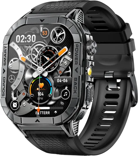 Reloj inteligente militar HD resistente: Presentamos el primer reloj inteligente de la industria con una exquisita pantalla táctil HD de 1.75 pulgadas y con una resolución de 466 x 466 píxeles. Diseñado con un cuerpo de metal robusto y una esfera redonda clásica, este reloj inteligente no solo satisface las necesidades de moda de los hombres, sino que también es perfecto para aquellos con dedos más gruesos. Nota: La pantalla de 1,75 pulgadas está diseñada para muñecas más anchas, con un diámetro total del reloj de aproximadamente 2.047 in; puede no ser adecuada para muñecas más delgadas. Batería de gran capacidad: este reloj inteligente táctico para hombre cuenta con una batería de 730 mAh, el doble de capacidad que los relojes inteligentes convencionales. Con un innovador algoritmo de inteligencia artificial de súper ahorro de energía, minimiza el consumo de energía al tiempo que permite un uso continuo en modo deportivo. El reloj se carga en solo 3 horas y proporciona de 7 a 10 días de duración de la batería con una carga completa, dependiendo del uso. Linterna LED integrada: este reloj inteligente de grado militar cuenta con una linterna LED integrada capaz de iluminar distancias entre 6 y 26.2 ft, por lo que es ideal para acampar, senderismo o aventuras nocturnas. La linterna puede iluminar tu camino en la oscuridad, asegurando excursiones nocturnas más seguras. También sirve como fuente de luz inmediata durante cortes de energía o emergencias, y los usuarios pueden activarla para enviar señales de socorro si es necesario. Realizar/recibir llamadas y notificaciones - El reloj inteligente ECHO con texto y llamadas cuenta con altavoces de alta calidad que admiten hacer y recibir llamadas e incluso reproducir música (por favor, asegúrate de haber conectado correctamente el audio Bluetooth de tu reloj). El reloj inteligente ECHO con capacidades de texto y llamadas aparecerá en tu muñeca y vibrará cuando recibas llamadas y mensajes (como Facebook, WhatsApp, Twitter, etc. ). Más de 100 modos deportivos y rastreadores de fitness: ofrece más de 100 modos deportivos, este reloj inteligente militar abarca casi todas las actividades físicas diarias. Realiza un seguimiento de la duración total del entrenamiento, la quema de calorías, el recuento de pasos y la distancia recorrida, proporcionando una descripción detallada de tu rendimiento físico. Con monitoreo de actividad durante todo el día, te ayuda a mantenerte al tanto de tu recuento de pasos, distancia y calorías quemadas, apoyando tus objetivos de fitness. (Nota: No se puede comparar con el equipo hospitalario, no con el equipo médico).