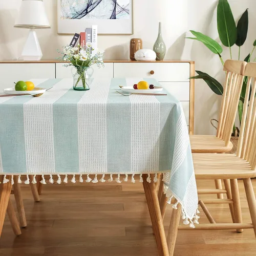 ¿Para qué sirve AmHoo Mantel rectangular de lino y algodón con borlas y costuras a rayas, a prueba de polvo, para cocina y comedor, 54 x 54 pulgadas, color verde?