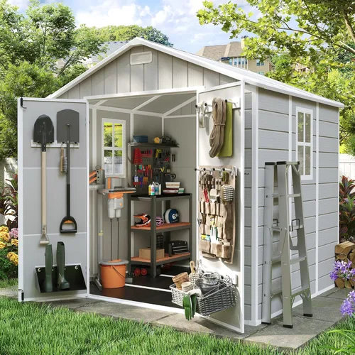 Cobertizo de resina con suelo - Soporta equipos pesados como cortadoras de césped sin hundirse Cuenta con 292.85 pies cúbicos de almacenamiento compacto pero funcional, ideal para cortadoras de césped de empuje, bicicletas, herramientas manuales, suministros de jardín, cojines para exteriores. Funciona bien como una solución de almacenamiento vertical u horizontal eficiente para artículos esenciales diarios al aire libre. Puertas con cerradura - Seguridad para sus herramientas y equipos Espacioso 8 pies x 6 pies. Capacidad de almacenamiento - cobertizo DEMENSION-Profundidad del techo: 78.3 "(profundidad), ancho del techo: 90.9" (L), altura total 88.5" (alto); base del suelo: 85.8" (L) x 74.2" (Ancho); Cobertizo para exterior construido con resina fuerte y con estabilidad reforzada - La resina es un material sintético de alta densidad que es liviano pero excepcionalmente fuerte, superando a la madera que se deforma o se pudre y al metal que se abolla o se oxida. Garantiza durabilidad en todo tipo de clima con un mantenimiento mínimo, proporcionando un almacenamiento duradero al aire libre.