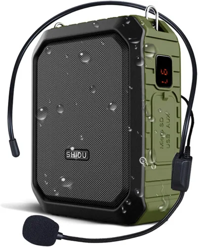 Es genial como altavoz porque la proyección de voz es clara y fuerte. Adecuado para el aula e incluso espacios al aire libre. El amplificador de voz portátil está bien construido, es firme y muy resistente cuando se sostiene en la mano. Ten en cuenta que el micrófono de los auriculares está cableado pero no inalámbrico. Amplificador de voz portátil compatible con Bluetooth, grabación, reproducción en bucle, entrada auxiliar, tarjeta TF, disco U. ¡Lo sorprendente es la capacidad de admitir la entrada del micrófono y la reproducción de música simultáneamente! El amplificador personal le permite ser escuchado y mantener el distanciamiento social. Las fundas de silicona impermeables del amplificador de voz y el diseño de interfaz garantizan a prueba de golpes, a prueba de polvo, nivel hasta IPX5. Firme, sólido y resistente Este auricular de micrófono portátil y altavoz tiene un clip que se puede enganchar a un cinturón y viene con una correa para el cuello que también se puede utilizar como accesorio para cinturón. Si eres profesor, guía turístico, presentador, vendedor, entrenador, instructor o personas que tienen una voz suave, enfermedad de Parkinson, la cuerda vocal está paralizada o susurra, entonces este es un buen amplificador de voz y altavoz de ayuda o megáfono o mini amplificador para ti.