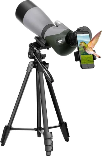 Trípode ajustable: este visor de detección satisface tus necesidades de 16.3 a 53.7 pulgadas para diferentes posiciones. Amplia aplicación para campo de tiro, observación de aves, tiro con arco y fotografía Perillas de enfoque dual: Las ruedas de enfoque de doble velocidad permiten un enfoque suave y preciso. La rueda de enfoque rápido ayuda a bloquear el objetivo rápidamente y la rueda de enfoque fina puede ofrecer más detalles Lente objetivo de película verde de 2.756 in totalmente multicapa y el último prisma BAK4 hacen que tu visión sea más brillante, clara y ofrece imágenes nítidas. Campo de visión a 131.1-65.4 pies/1000 yardas Los telescopios Spotter están diseñados con un aumento variable de 20X a 60X. Mantén el alivio ocular entre 0.591 in y 0.709 in, y puedes obtener un campo de visión adecuado Diseño humanizado: El ocular en ángulo de 45 grados puede eliminar la tensión del ojo y el cuello. El anillo de montaje giratorio y la base de montaje giratoria del trípode del alcance de localización pueden lograr diferentes ángulos de visión. Impermeable y a prueba de niebla que se puede utilizar en ambientes extremos