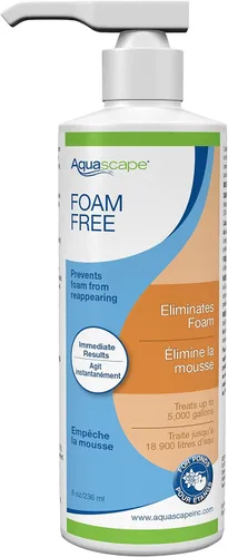 Aquascape Pond Foam Free elimina de forma segura la espuma cerca de las cascadas, ayudando a mantener la belleza de tu estanque. Aquascape Pond Foam Free está especialmente formulado para ayudar a mantener el agua libre de espuma y el tratamiento no es tóxico, por lo que es seguro para pájaros, peces, plantas y animales. La parte superior de la bomba fácil de usar mide con precisión 100 galones de tratamiento por bomba y la botella completa trata 5,000 galones de agua.