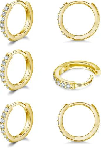 Aretes pequeños en forma de círculo de plata de ley 925 con circonia cúbica, 3 pares de aros chapados en oro blanco de 14 quilates para piercing en