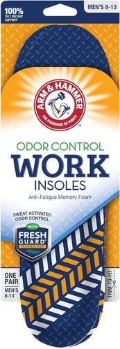 Máxima comodidad para los pies: la amortiguación de espuma viscoelástica ligera y duradera de las plantillas Arm & Hammer Work se moldea y alivia la presión en los pies que trabajan duro; el soporte superior del arco y la copa del talón contorneada proporcionan absorción instantánea de impactos Tecnología Fresh Guard: con el bicarbonato de sodio original de Arm & Hammer e ingredientes neutralizantes de olores incrustados en la tela superior para neutralizar y eliminar el olor no deseado de los pies; esta fórmula dejará los pies frescos durante todo el día Diseño antifatiga - El diseño relajante de estas plantillas para botas de trabajo te ayuda a estar de pie por más tiempo y con más comodidad; La fórmula de control de olores se activa con el sudor al entrar en contacto para ayudar a mantener los pies frescos Se adapta a todos los tipos de zapatos - Diseñado para adaptarse a tallas de zapatos de hombre 8-13 y tallas de zapatos de mujer 6-10; el diseño recortable te ayuda a recortarlas fácilmente para adaptarse al tamaño de tu pie; recorta con tijeras utilizando la guía de recorte en la parte inferior de la plantilla Arm & Hammer Calidad de confianza: una solución pura y simple de confianza durante más de 170 años; comprometido con la pureza y la calidad, Arm & Hammer crea una opción natural, efectiva y económica para cuidar cada habitación de la casa