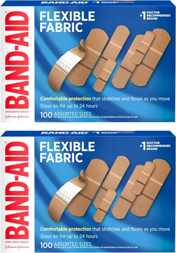 Este paquete doble contiene dos cajas de 100 vendas adhesivas cada una de la marca Band-Aid de tejido flexible en varios tamaños para primeros auxilios y protección de heridas menores, cortes, rasguños y quemaduras. Fabricadas con tejido con memoria para mayor comodidad y flexibilidad: estas vendas se estiran, doblan y flexionan con tu piel mientras te mueves e incluyen una almohadilla acolchada Quilt-Aid para brindarte mayor comodidad, que está diseñada para proteger las heridas dolorosas y para prevenir que te vuelvas a herir. Estas vendas adhesivas de tejido flexible de la marca Band-Aid permanecen adheridas hasta 24 horas y cuentan con una exclusiva almohadilla Hurt-Free que no se pega a la herida, ya que absorbe la sangre y los líquidos, lo que permite quitarlas con delicadeza. Las vendas adhesivas Band-Aid ayudan a proteger las heridas contra la suciedad y los gérmenes que pueden causar infecciones. Además, las heridas cubiertas con una venda se curan más rápido que las heridas descubiertas. Aplica la venda sobre la piel limpia y seca para el cuidado de las heridas pequeñas, y cámbiala a diario cuando se moje o según sea necesario. Para el cuidado adecuado de las heridas, aplica una pomada antiséptica, como Neosporin, antes de aplicar la venda.
