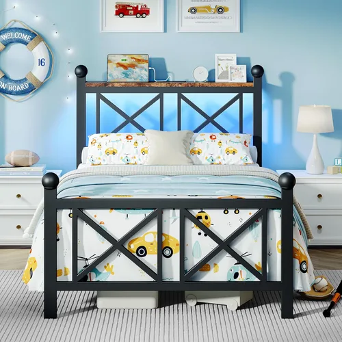 DynJest Base de cama negra de tamaño individual con luces LED, cama de metal resistente con cabecera y piecero, estante de almacenamiento con