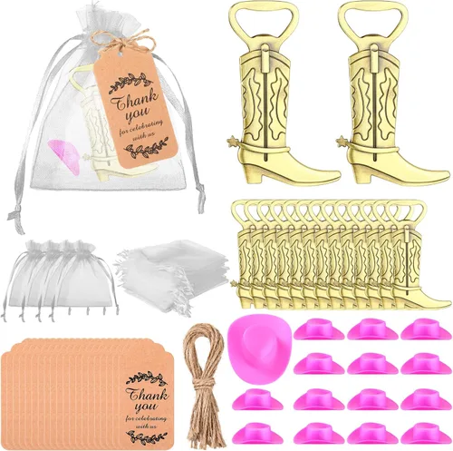 Pregunta sugerida sobre Batiyeer Paquete de 30 botas vaqueras abrebotellas con mini sombrero de vaquero rosa de plástico, baby shower, abrebotellas occidentales, recuerdos ¿Qué incluye exactamente este set?