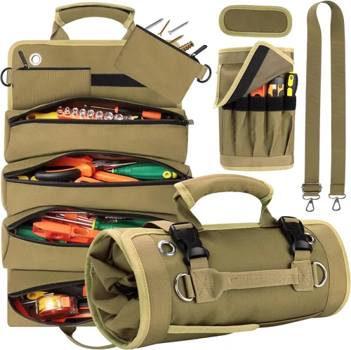 Diseño plegable para un fácil transporte: esta bolsa enrollable para herramientas tiene 4 compartimentos grandes fijos, 2 pequeñas bolsas desmontables con anillos en D y 5 bolsillos fuera de la bolsa. 2 bolsillos extraíbles que ofrecen una mejor opción para separar piezas pequeñas como engranajes, clavos y enchufes, para que no tengas que hurgarlos en un montón de herramientas. Enrolla y lo lleva. Satisface las necesidades de trabajo cuando vayas. 【Prácticos bolsillos adicionales】 Qué surperise. Sí, nuestra bolsa de herramientas se puede enrollar y sostener. Pero también se puede colgar a través de correas de hombro. 5 bolsillos fuera de la bolsa y colocar tus herramientas de emergencia en tiempo de funcionamiento. Material Oxford duradero 1000D: nuestras bolsas de herramientas están hechas de tela Oxford mejorada, materiales pesados y costuras reforzadas, lo que garantiza que pueda soportar el desgaste diario, resistente a la abrasión, pinchazos y desgarros. Las costuras reforzadas mejoran aún más la durabilidad de la bolsa, asegurando que puede soportar herramientas y accesorios pesados sin rasgarse ni deshilacharse. Fácil de limpiar, es una inversión duradera que mantendrá tus herramientas seguras y organizadas durante años. Ampliamente utilizado: la bolsa enrollable para llaves se puede utilizar para una variedad de tareas y trabajos, desde proyectos de bricolaje en casa hasta trabajos de construcción profesionales, como un barco/automóvil/motocicleta para reparaciones o bolsas de herramientas de kit de emergencia. Sería un buen asistente para carpintero, electricista, fontanero, reparador, artesano, etc. Regalos para él: te sorprenderá la cantidad de herramientas que caben en esta pequeña bolsa de herramientas. Y si te resulta difícil recoger un regalo para tu marido, tu padre, un miembro de la familia o tu amigo, esta bolsa enrollable de herramientas sería una buena opción para ti