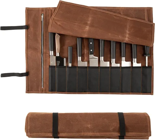 Esta funda portátil para cuchillos de chef está hecha con lona encerada de alta calidad que cuenta con 1 bolsillo con cremallera para mantener tus cuchillos seguros.