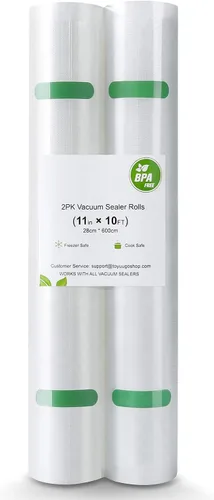 • → Rollo de vacío duradero de alta calidad: hecho de plástico libre de BPA de alta calidad, puedes hacer tu propio tamaño para un almacenamiento seguro de alimentos. Son muy duraderos y no perforan, rasgan ni rompen cuando se utilizan. → Mantente fresco durante más tiempo: estos rollos de vacío resistentes de 11.0 in x 10.0 in de largo cuentan con un patrón de puntos en relieve para maximizar la extracción de aire, manteniendo los alimentos sellados 5 veces más frescos que los métodos de almacenamiento alternativos. → Seguro y cómodo y sin riesgos: libre de BPA, apto para microondas, congelador, reutilización, lavado, hervir y lavavajillas. Ideal para cocinar a baja temperatura. Protege los alimentos de alimentos congelados, podredumbre y olores desagradables, perfecto para congelar o almacenar sobras. Gran compatibilidad al vacío: estos selladores al vacío compactos miden 11.0 in (ancho) x 9.8 ft (largo) por rollo para un total de 19.7 ft. Son compatibles con muchos selladores al vacío, especialmente algunos con cortadores incorporados. Funciona perfectamente con selladores al vacío. → Servicio sin preocupaciones: La garantía confiable le brinda tranquilidad, ofrecemos 1 año de garantía, 100% satisfacción del cliente y vienen con un excelente servicio al cliente y soporte técnico calificado. Si tienes alguna pregunta, no dudes en ponerte en contacto con nosotros.