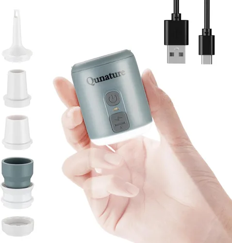 Compacta y ligera: esta bomba de aire portátil pesa solo 3.6 oz y mide 1.79 x 1.79 x 2.34 pulgadas, esta mini bomba es aproximadamente del tamaño de un huevo. El diseño pequeño y ligero de la bomba de aire hace que sea fácil de colgar en una mochila o deslizarse en tu bolsillo para una máxima portabilidad Potente inflado y desinflado: esta bomba de aire eléctrica ofrece capacidades de inflado y desinflado. Con una sola carga, puede inflar docenas de almohadillas de camping y colchones de aire (dependiendo del tamaño del producto). Con boquillas bidireccionales para facilitar el inflado y desinflado Luz de campamento: la luz de campamento incorporada en la base proporciona iluminación de área amplia con 3 niveles de brillo ajustables, perfecto para acampar al aire libre, paseos nocturnos o iluminación de emergencia. También incluye un anillo magnético, lo que te permite fijarlo a automóviles, bastidores de metal u otras superficies magnéticas para una iluminación cómoda Boquillas versátiles y amplia aplicación: nuestra mini bomba viene con 5 boquillas, por lo que es compatible con la mayoría de los inflables de tamaño pequeño a mediano, incluyendo colchones de aire, almohadas inflables, camas inflables, flotadores de piscina, almohadillas de dormir, bolsas de compresión, muebles inflables y más (no aplicable a globos, pelotas de baloncesto, neumáticos) Recargable y fácil de usar: alimentada por una batería de 1600 mAh, esta bomba de aire ofrece hasta 35 minutos de funcionamiento continuo. La interfaz de carga tipo C cuenta con un indicador LED: rojo para una carga del 0-99% y verde para una carga completa. Para un rendimiento óptimo, evite usar la bomba continuamente durante más de 10 minutos