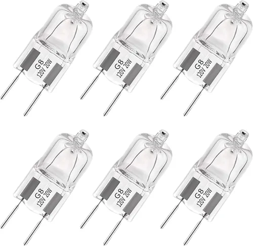 Base, Forma y Dimensiones Base: G8 de 2 pines bi-pin con distancia de 8 mm entre pines Forma: T4 Tubular JCD Diámetro: 0.512 pulgadas Longitud: 1.57 pulgadas (versión mini) Asegúrate de que la base de la bombilla coincida con la que tiene tu lámpara. Una confusión común es con las bombillas G4 de 2 pines porque se ven muy similares en las fotos, pero el G4 tiene una distancia entre pines mucho más pequeña de 4 mm en lugar de 8 mm. Por favor, verifica la distancia de tu pin antes de realizar el pedido. Características de iluminación Potencia: 20 vatios Flujo luminoso: 190 lúmenes Voltaje: 110V, 120V, 130V CA Ángulo de haz: 360° Material: Vidrio Índice de reproducción cromática (CRI): 100 para un color vivo y mejorado Encendido instantáneo. Sin mercurio. Vida útil: 2000 horas (1,8 años con un promedio de 3 horas de uso por día) Certificado CE y RoHS Paquete de 6 Trabajo con atenuadores halógenos Estas bombillas halógenas son regulables utilizando los reguladores diseñados para bombillas incandescentes y halógenas. Todas las bombillas incandescentes y halógenas son regulables utilizando reguladores tradicionales, ya que estos reguladores simplemente ajustan el nivel de voltaje para atenuar. La atenuación con reguladores LED solo dará como resultado incompatibilidad, ya que los reguladores LED funcionan de manera muy diferente. Por favor, comprueba la compatibilidad de tu interruptor de atenuación o accesorio de iluminación antes de comprar.