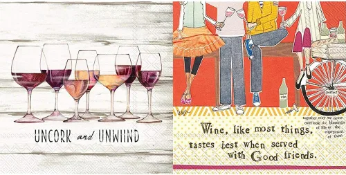 Producto 1: Servilletas de papel de 3 capas: paquete de 20 servilletas de papel de primera calidad Producto 1: PARA COCTEL Y BEBIDAS: Las servilletas miden 5 x 5 pulgadas (tamaño plegado); se utilizan para disfrutar de aperitivos de fiesta, ideales debajo de las bebidas para proteger las mesas Producto 1: DECORACIÓN DE MESA FESTIVA: Copas de vino tinto y blanco sobre fondo de grano de madera, el sentimiento dice: Descorcha y relájate Producto 1: SUAVE Y FUERTE: Servilletas resistentes con un tacto suave; impresas en Alemania con tintes no tóxicos solubles en agua Producto 2: SERVILLETAS DE PAPEL PREMIUM: Paquete de 20 servilletas de papel premium de 3 capas Producto 2: PARA FIESTAS DE COCTEL Y BEBIDAS: Las servilletas miden 5 x 5 pulgadas (tamaño plegado); se utilizan para disfrutar de aperitivos de fiesta, ideales debajo de las bebidas para proteger las mesas Producto 2: Una representación colorida de collage de amigos disfrutando de un picnic relajado con vino; frase dice vino, como la mayoría de las cosas, sabe mejor cuando se sirve con buenos amigos Producto 2: SUAVE Y FUERTE: Servilletas resistentes con un tacto suave; impresas en Alemania con tintes no tóxicos solubles en agua