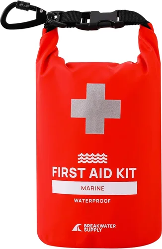 PREPARACIÓN IMPERMEABLE EN UN KIT COMPACTO! Alrededor del agua, un kit de emergencia de primeros auxilios totalmente impermeable es imprescindible. El kit de primeros auxilios marinos a prueba de agua incluye 100 suministros de emergencia, todo en un solo lugar y de fácil acceso. KIT DE TRAUMA COMPLETO: Hay 30 vendas adhesivas, gasa compresiva y absorbente, y un gran vendaje triangular para heridas graves. También hay un torniquete elástico sin látex y herramientas de apósito que incluyen tijeras, pasadores de seguridad, cinta de primeros auxilios y pinzas de metal. Equipo de emergencia fuera de hora: preempaquetado con equipo adicional para emergencias en el agua, incluyendo 13 pies de cuerda de paracaídas naranja brillante, 16.4 ft de cinta de PVC impermeable, una multiherramienta con alicates y una luz LED, poncho de lluvia, manta de emergencia, brújula 4 en 1 + silbato + lupa + termómetro, y dos palos de luz. Llévalo contigo: este kit no solo es uno de los más ligeros que encontrarás con solo 1.3 libras, sino que el mosquetón de bloqueo resistente y el símbolo reflectante de primeros auxilios hacen que este kit sea perfecto para enganchar a tu bolsa seca, kayak, tabla de remo, barco o silla de socorrista. Ser visto con poca luz mientras navega por el agua. Nuestra garantía: Hemos creado este kit para ser el accesorio perfecto para estar en el agua. Te garantizamos que te encantará. Estamos con sede en Estados Unidos, registrados por la FDA y comprometidos a asegurarnos de que estés satisfecho. Regalo ideal para exteriores: elige uno como un gran regalo para guardar en el automóvil, barco, cabina o mochila de senderismo.