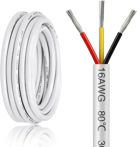 Alta conductividad: Alambre de 3 núcleos: Negro, Rojo y Amarillo, 26 hebras de alambre de cobre estañado de 0.25 mm están dentro de cada núcleo; Diámetro exterior del alambre: 6.7 mm. El cobre libre de oxígeno de alta pureza conduce bien la electricidad Especificación: Cable calibre 16, total 10 pies, Voltaje máximo: 300 V (también puede ser para 5 V, 12 V, 24 V hasta 300 V), Corriente máxima: 11 A; Temperatura hasta 80℃/176℉ Material PVC duradero: La cubierta es de PVC aislado (RoHs), que protege el cable contra la abrasión, resistente a la luz solar y productos químicos. Chaqueta color blanco Fácil de usar: el cable eléctrico es flexible, fácil de pelar, soldar y cortar. Cable 16AWG para instalaciones de iluminación paisajística de bajo voltaje Ampliamente utilizado: El cable de calibre 16 se usa ampliamente en varios cableados de dispositivos electrónicos de baja tensión, tira de luz LED, bombilla, paneles solares, transformador, circuitos de CC, barco, marino, automotriz, altavoz, audio, estéreo, etc