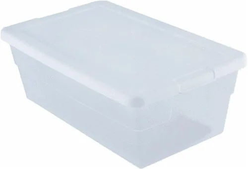 Caja de almacenamiento Sterilite, tapa color blanco con base transparente, 36 cajas. Fabricado en los Estados Unidos. Base transparente. Con asas para levantamiento fácil.