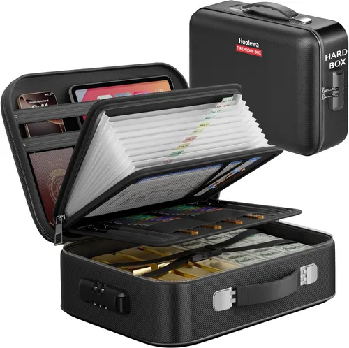 Sentido de gran seguridad del almacenamiento de documentos: la superficie de la caja de documentos ignífuga está hecha de capas de fibra de vidrio recubierta de silicona ignífuga de alta calidad que no pica que puede soportar temperaturas de hasta 5200 °F. Al mismo tiempo, es extremadamente impermeable, lo que puede evitar que sus documentos importantes y objetos valiosos se destruyan en un accidente. Imprescindible para cualquier persona que busque una solución confiable, portátil e ignífuga para caja ignífuga. Caja de documentos ignífuga de carcasa rígida: diseñada pensando en la seguridad y el estilo, esta caja duradera ofrece una protección avanzada a prueba de fuego, asegurando que tus documentos importantes, documentos legales y recuerdos preciados permanezcan a salvo de incendios inesperados. Su exterior elegante y de carcasa dura no solo protege tu contenido del calor, sino que también resiste los impactos. Ya sea en casa o en la oficina, confía en nuestra caja de documentos para mantener tus artículos esenciales seguros durante años. Gran capacidad: la caja de documentos ignífuga de gran capacidad ofrece un generoso espacio de almacenamiento con dimensiones externas de 15 x 11 x 5 pulgadas y dimensiones internas de 14.4 x 10.4 x 4.4 pulgadas. Diseñada para la máxima organización y protección, esta caja ignífuga viene equipada con 12 bolsillos de acordeón, 2 bolsas de malla principales, 16 ranuras para tarjetas, 2 bolsillos para unidades USB y 4 soportes para bolígrafos, proporcionando un amplio espacio para almacenar de forma segura tu portátil, documentos importantes, dinero en efectivo, pasaportes, unidades USB, tarjetas y certificados. Mantén tus objetos de valor organizados, seguros y protegidos del fuego y daños con esta solución de almacenamiento espaciosa y versátil. Caja ignífuga con cerradura de combinación: equipada con un bloqueo mecánico codificado para una mayor seguridad, esta caja resistente ofrece la máxima protección. Una cremallera de metal duradera y un mango de metal resistente añaden comodidad y fiabilidad, por lo que es ideal para emergencias. Innovador diseño humanizado: diseño con un asa fuerte para llevar todo lo que necesitas fácilmente. No solo puedes ponerlo en tu hogar, oficina, automóvil, armario de almacenamiento, sino que también puedes llevarlo a camping, viajes y diversas actividades al aire libre. Por supuesto, regalarlo a tus familiares, clientes o empleados también es una buena opción.