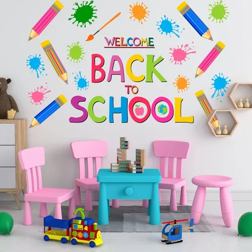 Calcomanías de pared de bienvenida de regreso a clases, calcomanías de pared de crayón de colores para el primer día de escuela, murales de pared