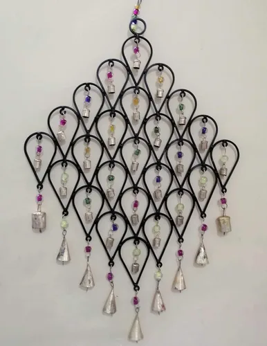 Material: hierro reciclado, cuentas de vidrio, pieza de pared decorativa Decorado con pequeñas campanas de lata y cuentas de colores Tamaño al colgar: 16.1 in de ancho x 27.2 in de alto Hecho de cuentas recicladas y hierro, el timbre es un producto de comercio justo Artesanía de metal indio