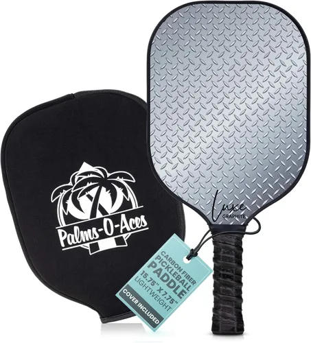 Con una superficie de grafito premium y núcleo de panal de polipropileno, esta paleta compuesta logra un equilibrio entre potencia y precisión. La fibra de carbono Toray 700 es ideal para el control y el centrifugado, mientras que el núcleo de panal de polipropileno proporciona una estructura estable con un generoso punto dulce. Un protector de borde mejorado evita daños al deslizar el suelo. El mango de cuero sintético perforado absorbe el sudor dándote un agarre firme y antideslizante en la raqueta de pickleball. El mango acolchado proporciona comodidad acolchada para evitar la fatiga. El mango ligeramente más largo proporciona un mejor alcance, mayor apalancamiento en los servicios y más potencia. Fácil de usar: nuestras palas de pickleball de grafito ligeras cumplen con las especificaciones de USAPA para uso en interiores y exteriores. La paleta es de 7.8 onzas pero potente, por lo que es una gran opción para una pala de pickleball de fibra de carbono y todos los niveles de habilidad. Las dimensiones son 15.75 pulgadas x 7.75 pulgadas (largo x ancho). Fácil de usar: construido para un alto rendimiento, nuestro método único de impresión UV proporciona una paleta de pickleball de fibra de carbono texturizada para control de la pelota y giro adicional. Manteniendo el rendimiento y la apariencia, la superficie duradera durará más que las raquetas de pickleball pintadas tradicionales. Se incluye una funda de neopreno ajustada. Manteniendo nuestros estándares de calidad intransigentes en la selección de materiales, fabricación y embalaje, todas las paletas de pickleball Palms-O-Aces están diseñadas, inspeccionadas y empaquetadas en los Estados Unidos. Ofrecemos una garantía de un año y atención al cliente de fácil acceso.