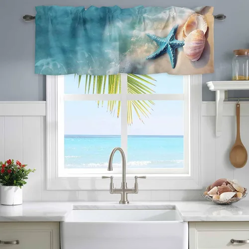 Cenefas de verano para cocina, cafetería, cenefa de ventana con diseño de estrella de mar costera azul, 42 x 12 pulgadas, bolsillo para barra,