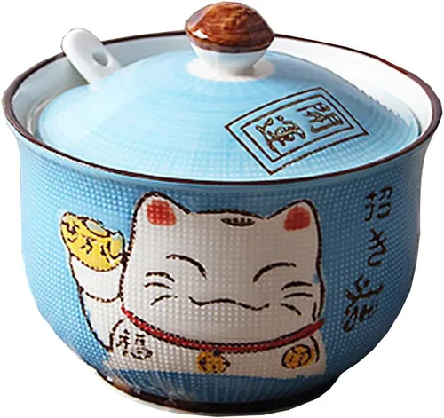 Cerámica japonesa Maneki Neko Lucky Cat Azúcar Sal Pimienta Tarro de almacenamiento con tapa y cuchara