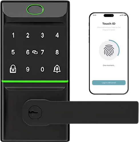 Acceso inteligente sin llave 6 en 1: desbloquea tu puerta a tu manera: huella digital, código de acceso, tarjeta IC, llave mecánica, botón de un solo toque o remotamente a través de la aplicación Tuya: máxima flexibilidad y control total. Reconocimiento biométrico rápido: el sensor avanzado de huellas dactilares semiconductor se desbloquea en solo 0.5 segundos y almacena hasta 50 impresiones únicas para un acceso confiable. Bluetooth y control remoto a través de la aplicación Tuya (Wi-Fi de 2.4 GHz): conecta directamente a tu teléfono inteligente a través de Bluetooth para un acceso local rápido y seguro. Para el control remoto, alertas en tiempo real e integración de hogar inteligente, úsalo con una puerta de enlace o concentrador (se vende por separado) a través de Wi-Fi estable de 2.4 GHz para bloquear/desbloquear desde cualquier lugar, generar códigos de invitados y ver registros de entrada instantánea en tu teléfono. Función de bloqueo automático para mayor seguridad: bloquea automáticamente la puerta detrás de ti, para que nunca te preocupes por olvidar. Perfecto para familias, niños y mañanas ocupadas. Batería de larga duración + alimentación de emergencia tipo C: alimentado por 4 pilas AA para hasta 8 meses o más de 5000 desbloqueos. El puerto tipo C garantiza el acceso de emergencia incluso cuando la energía se agota. Construcción fuerte y seguridad de nivel de cerrojo: hecho de aleación de zinc duradera y plástico ABS, resistente a la intemperie y resistente a los impactos, manteniendo tu hogar protegido durante todo el año. Fácil instalación – No requiere cableado – Diseñado para puertas estándar (1.378–2.165 in) con mortaja ajustable de 60/2.756 in. Se instala en minutos con las herramientas incluidas, no necesita cerrajería. ️ Compatible con puertas izquierda y derecha (manijas de 2 x 4 pulgadas) – Viene con manijas para zurdos y diestros para compatibilidad universal de puertas: diseño inteligente simple. Ideal para hogares, alquileres y oficinas: perfecto para puertas delanteras, propiedades de Airbnb, espacios compartidos o lugares de trabajo que necesitan acceso inteligente y seguro. Aspecto moderno que eleva tu entrada: elegante acabado negro con un mango minimalista que añade un toque de sofisticación mientras aumenta la seguridad y el estilo de tu hogar.