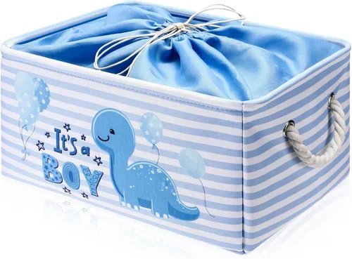 Dimensiones ideales: tamaño aproximado de 15.75 x 11.81 x 8.27 pulgadas, la cesta de almacenamiento para bebé se adapta cómodamente a la mayoría de los espacios, resolviendo sin esfuerzo problemas de desorden; ya sean juguetes de bebé, ropa o pañales, esta canasta de dinosaurio de tamaño adecuado ofrece un amplio almacenamiento, contribuyendo a un espacio de juego limpio, organizado y seguro Materiales de calidad: esta caja de regalo para baby shower está fabricada con una mezcla de lino de algodón, lona y Eva; su esquema de color azul y blanco ofrece una influencia calmante; además de su practicidad, esta canasta también sirve como una elegante caja de almacenamiento para guardería en cualquier decoración de habitación Diseño de cierre de cordón: las cajas de regalo de bebé para baby shower están equipadas con un diseño de cierre de cordón, esta característica mejora la seguridad y accesibilidad de las pertenencias de tu hijo, ya no te preocupes por artículos sueltos o el desorden de juguetes y de fácil acceso Fácil de limpiar: el contenedor plegable para juguetes no solo es cómodo de almacenar, sino que también es fácil de limpiar, mantiene el espacio de tu bebé sanitario, ofreciéndote tranquilidad; esta caja de regalo para bebé no solo sostiene los elementos esenciales de tu pequeño, sino que también tiene una experiencia de limpieza fácil Regalo ideal para baby shower: estas cestas de bebé para baby shower son una elección ideal; útil, atractiva y duradera, será apreciada por las mamás; con adorables estampados de dinosaurios, sirve como un complemento encantador para la mayoría de los niños
