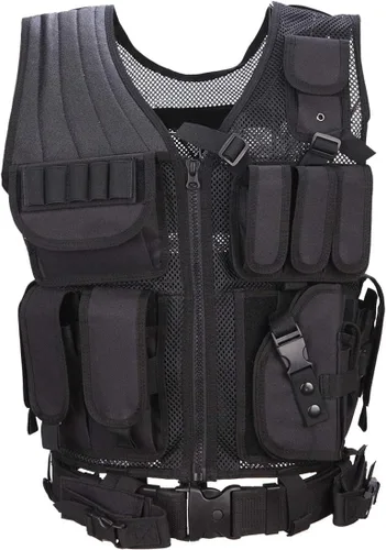 Nombre: Chaleco táctico Peso: 3.7 lbs Dimensiones: longitud 23.6 in, ancho 19.7 in/24 pulgadas (alto), 4 pulgadas de ancho. Color: negro Las correas y cinturones de terciopelo ajustables permiten un movimiento lo suficientemente suelto para una libertad total. Equipado con cremallera, cinturón y hebilla de cinturón, se puede ajustar y fácil de usar. Muchos bolsillos pueden proporcionarte más capacidad de almacenamiento, y tus herramientas se pueden organizar. Bolsa funcional ajustable y desmontable, bolsa de revista. La bolsa de pistola desmontable es adecuada tanto para zurdos como diestros. Hecho de poliéster de cifrado 600 D, duradero y duradero. Utiliza tela transpirable de malla. El sistema de ventilación de malla hace que el chaleco táctico sea suave, cómodo y ligero en peso. 2 grandes bolsillos interiores con cremallera y un bolsillo trasero de malla donde puedes poner mapas y documentos. Adecuado para la mayoría de pistolas de diferentes tamaños. Nuestros chalecos son adecuados para juegos de disparos, caza, cojines de aire, huevos de Pascua. Así que ponte el chaleco y disfruta de la victoria