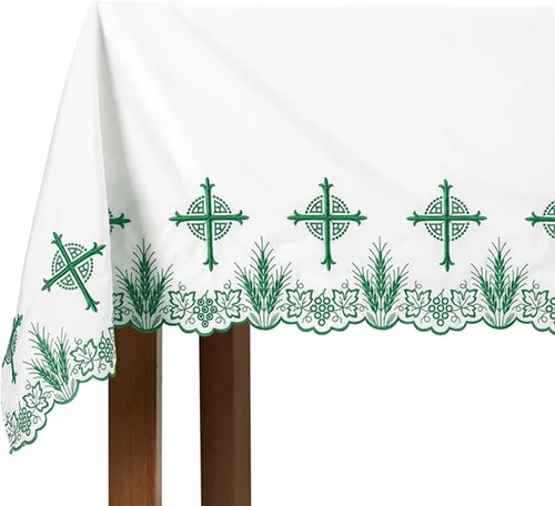 Tradicional altar eucarístico frontal en un aspecto de lino blanco con diseño de cruz verde Hecho de una mezcla duradera de 65% poliéster y 35% algodón con un acabado suave similar al lino Mide 96 x 52 pulgadas, adecuado para la mayoría de mesas de altar estándar Cuenta con una tela blanca clásica con diseño de cruz para un aspecto tradicional La tela de fácil cuidado es resistente a las arrugas y lavable a máquina para un uso a largo plazo