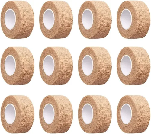 Color de la piel, 1 pulgada de ancho por 14.7 pies de largo por rollo El vendaje se adhiere a sí mismo. tienen capacidad autoadherente. No necesita clips ni alfileres y no se pega al cabello o la piel. Vendajes elásticos que son fuertes y proporcionan un excelente apoyo Material suave, ligero y cómodo. Cinta elástica para dedos que es estable, soporte controlado y reutilizable