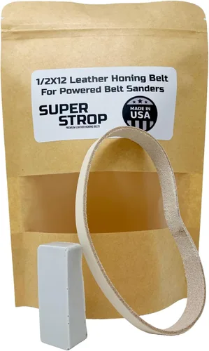 El Super Strop de 1/2X12 está diseñado para funcionar con la lijadora de banda original Work Sharp. Este cinturón de cuero para afilar llevará el borde de tu cuchillo de afilado a aterrador afilado Se incluye un compuesto de pulido de muestra. El compuesto es un abrasivo ultra fino que se aplica a la correa de cuero Stropping. El compuesto de pulido ayudará a refinar el borde de su cuchillo, eliminando fragmentos muy pequeños de la rebaba o borde de alambre. La eliminación de estos fragmentos puede prolongar la vida útil del borde. Los cinturones se hacen ligeramente cortos y pueden requerir estiramiento para instalarse. Si crees que tu cinturón es demasiado pequeño, ponte en contacto con nosotros hoy Hecho de cuero de alta calidad. ¡Cada uno de nuestros cinturones de cuero está garantizado! Si su cinturón de cuero falla por cualquier motivo, contáctenos para un reemplazo inmediato Obtén un aspecto profesional, bordes pulidos de espejo que no solo se ven geniales, sino que están listos para trabajar