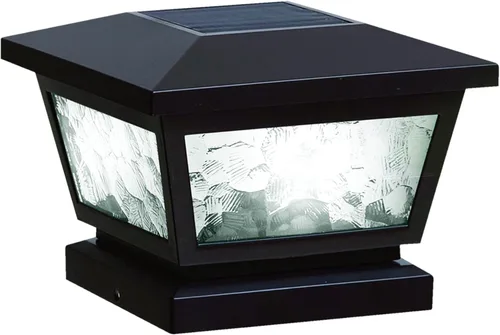 La novedosa tapa solar Fairmont negra versátil para todo tipo de clima se puede utilizar para montaje en poste o pared con fácil instalación. Se complementa con vidrio de guijarros real y dos LED de alto rendimiento que emitirán una luz blanca brillante. Se adapta a más de 3 tamaños de poste: 5 x 5, 4 x 4 o 3. 5 x 3. Poste de 5 pulgadas. (Adaptador de pared incluido)