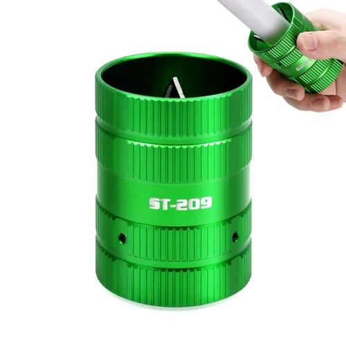 Cuchillo con bisagras de acero: la superficie de esta herramienta de desbarbado está hecha de metal con cuatro expansores afilados dentro y fuera. Puede eliminar fácilmente las rebabas en tubos de cobre y PVC, asegurando conexiones seguras. Carcasa de metal duro: en comparación con las herramientas de desbarbado de plástico, es menos probable que la carcasa de metal duro de esta herramienta se deforme durante el uso, proporciona un excelente agarre y mejora la seguridad y la eficiencia durante la eliminación de rebabas. Rango de corte: esta herramienta es adecuada para tuberías con diámetros exteriores e interiores que van desde 1/4 a 5/8 pulgadas. 【Escena de aplicación】Es adecuado para tubos pequeños de PVC, acero inoxidable, cobre y aluminio, por lo que es ideal para su uso en hogares, talleres y varios entornos de plomería y decoración. Ligero y práctico: mide 2 pulgadas de diámetro y 2.56 pulgadas de altura, esta pequeña herramienta no ocupará demasiado espacio en tu caja de herramientas. El accesorio es imprescindible para cualquier caja de herramientas de bricolaje.