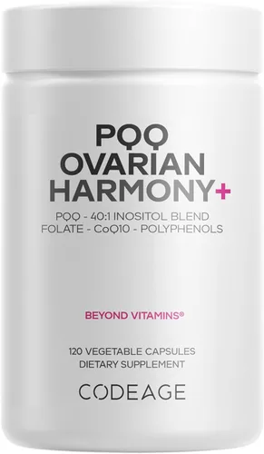 Unique PQQ and Inositol Blend: Codeage PQQ Ovarian Harmony supplement combines Pyrroloquinoline Quinone Disodium Salt (PQQ) with a 40:1 ratio of Myo-Inositol and D-Chiro-Inositol. Includes Folate 5-MTHF and CoQ10: This PQQ supplement features folate as 5-MTHF, a bioavailable form of folate, along with Coenzyme Q10. Enriched with Wild Blueberry and Pomegranate Extracts: Contains natural extracts of wild blueberry and pomegranate. Liposomal Delivery: This CoQ10 and PQQ supplement features a liposomal delivery made with a phospholipid complex utilizing non-GMO sunflower oil for added purity. Manufactured in the USA: Formulated for women, this PQQ supplement is vegan, non-GMO, gluten-free, soy-free, and dairy-free. It is manufactured in the USA with global ingredients in a cGMP-certified facility for quality and purity. Each bottle provides a one-month supply.