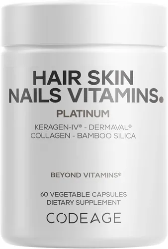 Ingredientes clínicamente estudiados: Codeage Hair Skin Nails Platinum es una fórmula de suplemento premium que ofrece queratina keraGEN-IV, un ingrediente clínicamente estudiado que puede ayudar a apoyar la estructura y apariencia del cabello, la piel y las uñas. * keraGEN-IV puede trabajar sinérgicamente con el colágeno para promover la capacidad del cuerpo para producir proteínas estructurales para apoyar positivamente las arrugas, los folículos pilosos y las uñas. * Mezcla de fitonutrientes con Dermaval: Este suplemento para el cabello y la piel también cuenta con Dermaval, una mezcla de fitonutrientes a base de plantas como granada, acerola, mangostán y Coffeeberry, estudiado por su potencial para ayudar a apoyar las proteínas de colágeno y elastina. * Biotina, colágeno y PABA: el suplemento de vitaminas Codeage para el cabello, la piel y las uñas también ofrece 5,000 mcg de biotina por porción, complementado con péptidos de colágeno, ácido hialurónico y PABA. Vitamina C y entrega liposomal: Codeage Hair Skin Nails Vitaminas Platinum también proporciona una fuente múltiple de vitamina C, combinada con extracto de hoja de bambú. Este suplemento de vitaminas para el cabello, la piel y las uñas también ofrece un sistema de administración liposomal, utilizando un complejo fosfolípido de lecitina de girasol no transgénica. Fabricado en los Estados Unidos: Codeage Hair Skin Nails Platinum ofrece 30 porciones por botella, proporcionando un suministro de 1 mes de soporte para el cabello, la piel y las uñas. * Esta fórmula multivitamínica para el cabello no contiene OMG y está libre de lácteos, soja, gluten y mariscos. Este suplemento de vitaminas para el cabello y las uñas se fabrica en los Estados Unidos utilizando ingredientes globales en una instalación certificada por cGMP para calidad y pureza.